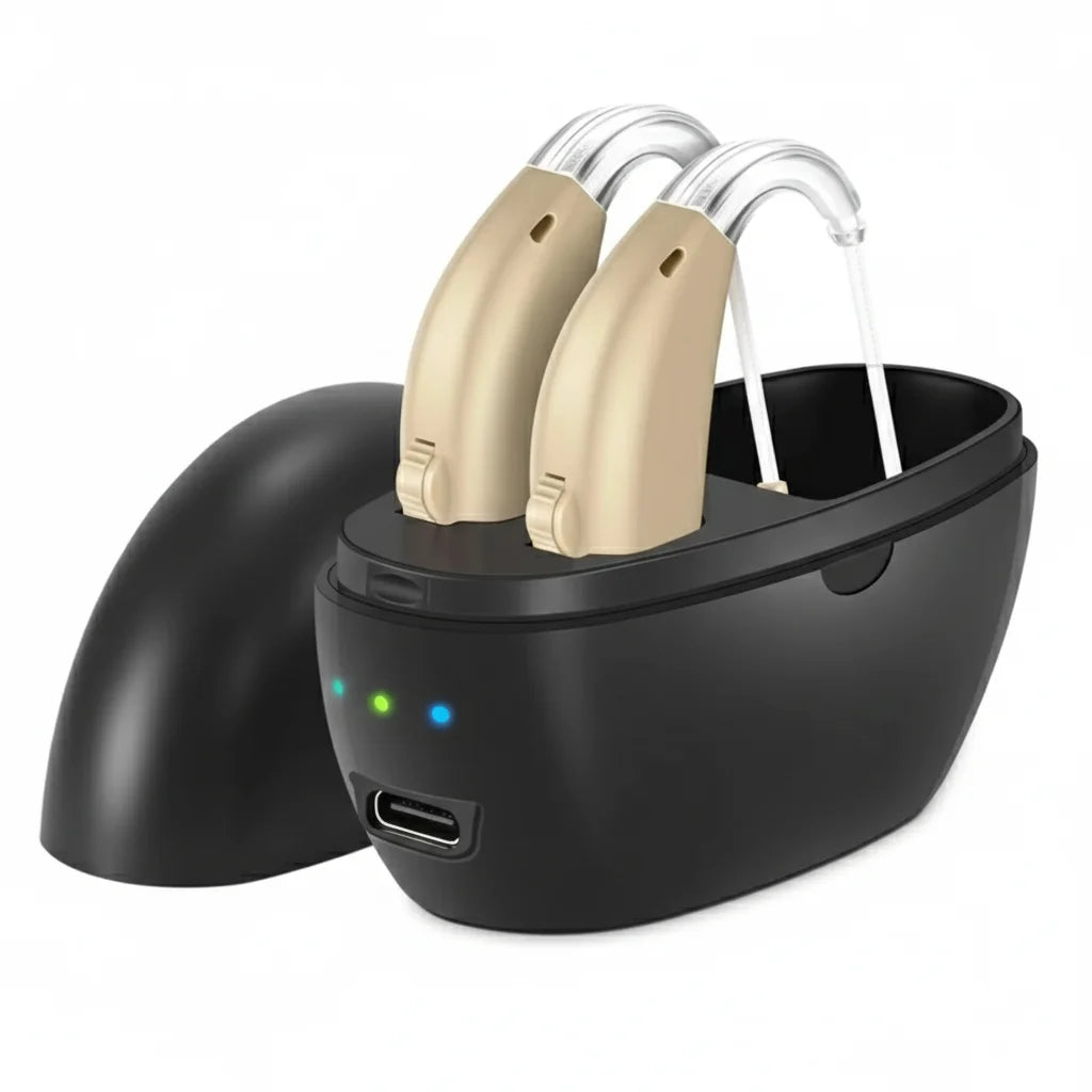 No more fumbling with tiny batteries. just pop your aids into the sleek charging case at night for a full day of uninterrupted, clear hearing. simple and stress-free.